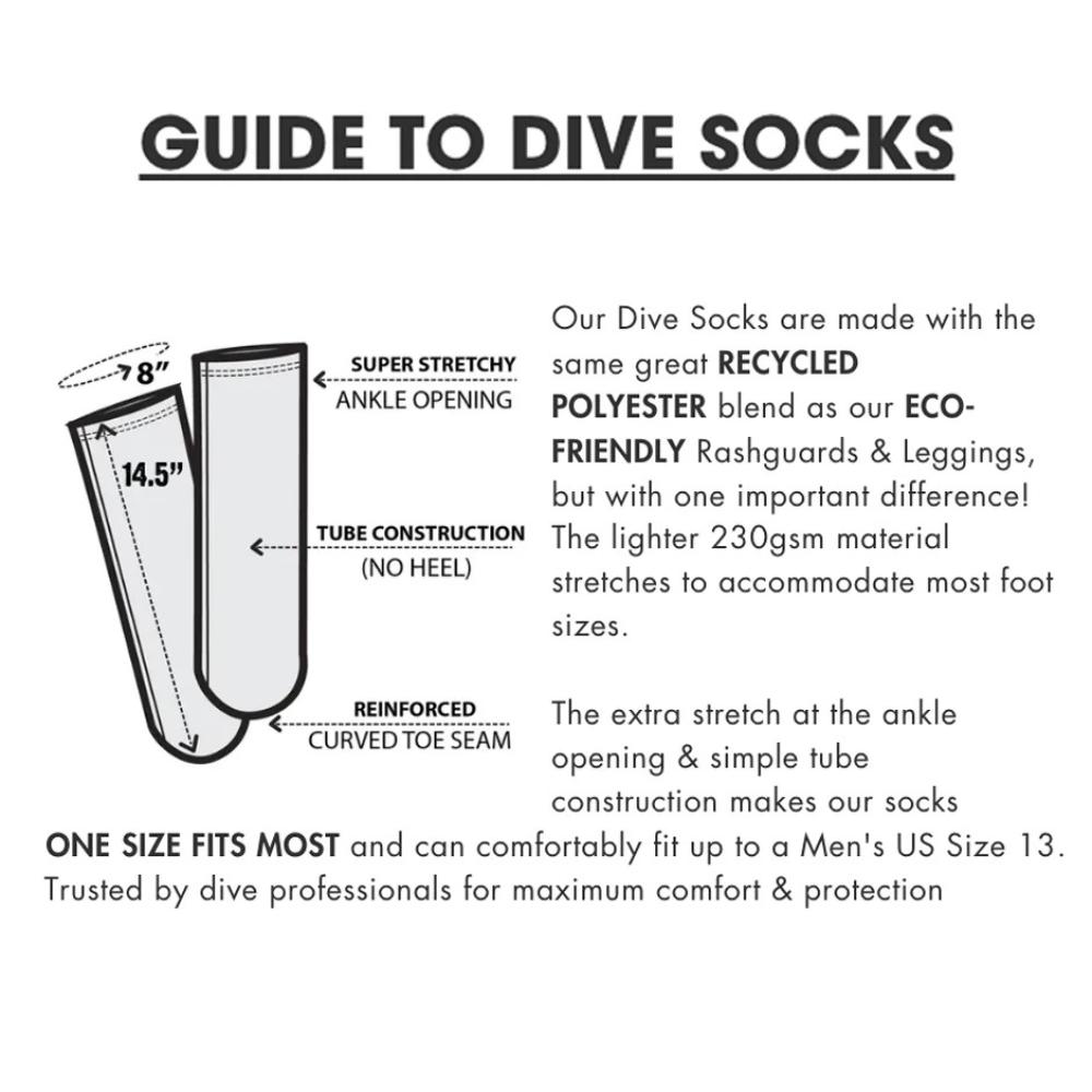 Fins can be rough on your feet. Slip into these stretchy & comfortable Socks, made from a quick dry poly blend to protect against blisters and make getting in and out of your wetsuit and booties a breeze! Graphics are sublimation printed, giving you a bold, all-over design.